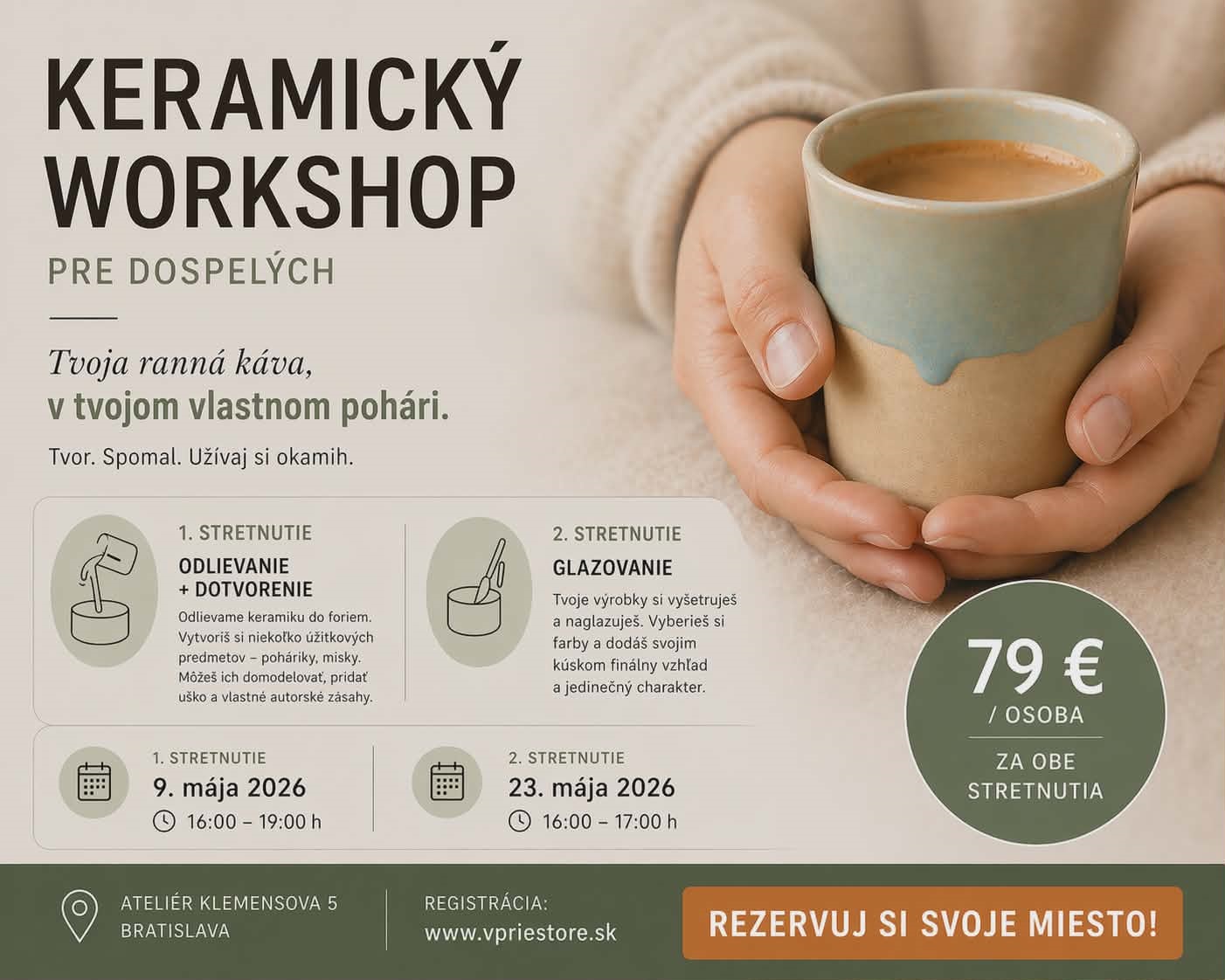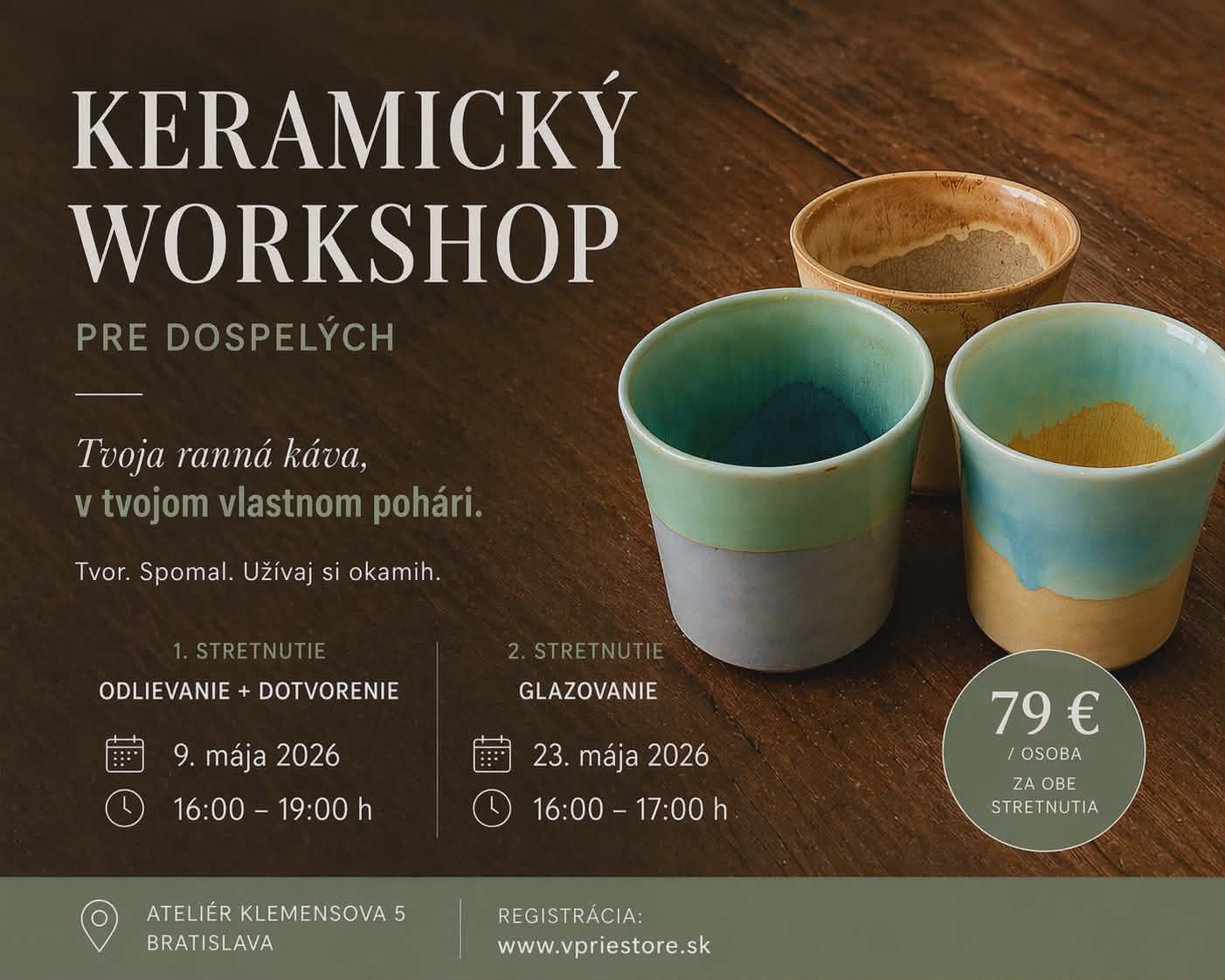 Pozývame ťa na dvojdielny keramický workshop v krásnom, útulnom ateliéri v centre mesta. V príjemnej a kreatívnej atmosfére si vytvoríš vlastné originálne kúsky, ktoré budeš používať každý deň.